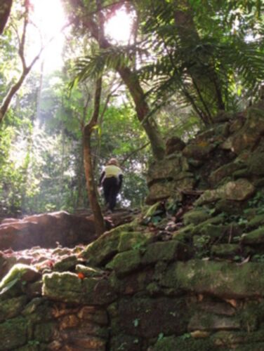 ぐるぐるがたがたの山道を、標高60mまで下りてきました。見渡す限り、すっかり緑緑緑。 そんな中に点在する遺跡群。 ジャングルを抜けると・・・・・ 突然目の前に広がる古代の風景。 わずか300年前まで人目につかず眠っていたというマヤの聖域。 古代の割に…